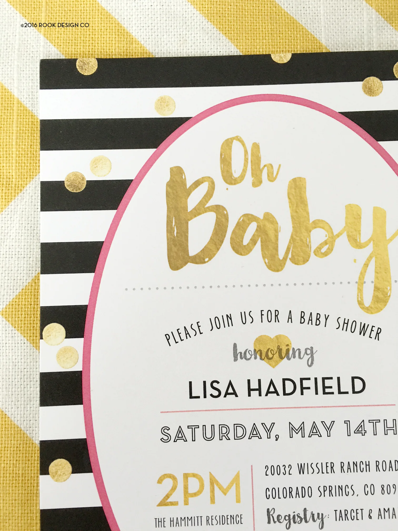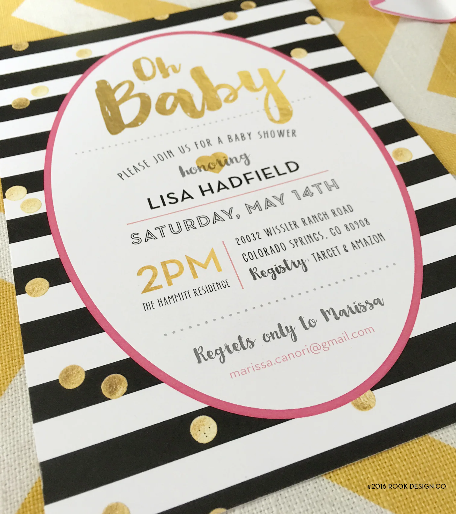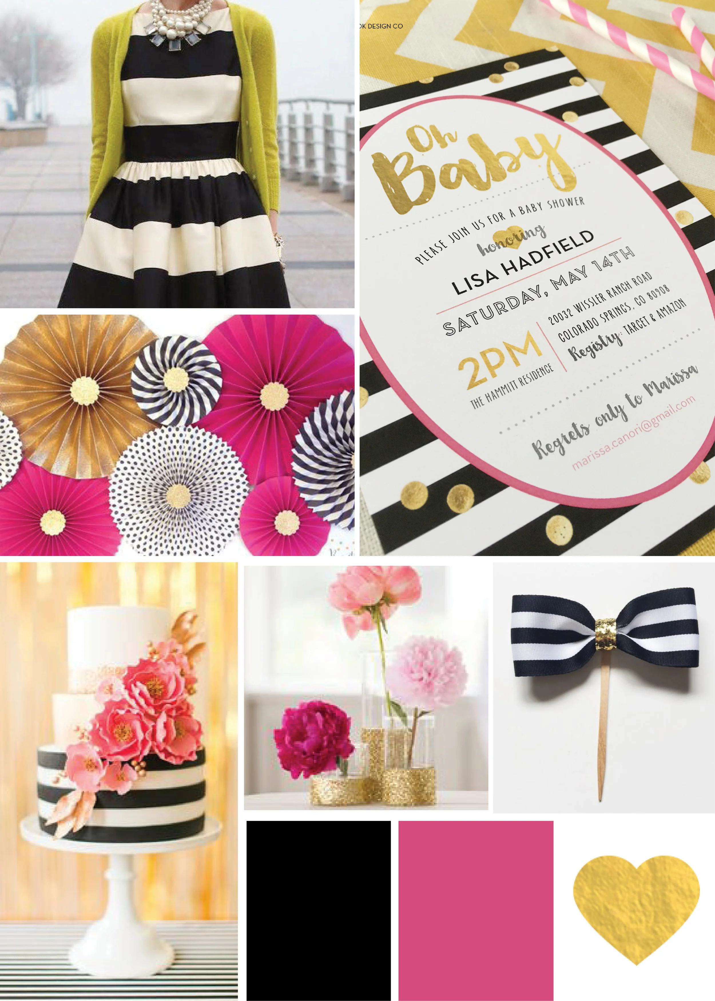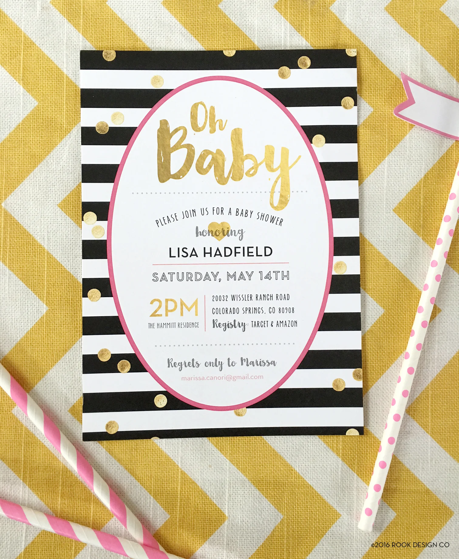 Hola readers! I have an adorable new Kate Spade inspired baby shower invitation added to my shop. The momma to be is as sassy as she is classy. So when we chatted about her ideal baby shower invitation, this festive gold confetti, black and white stripe felt so right. Paired with a hot pink accent for her darling little girl, Finley. Stay tuned for more coordinating signage for this kate spade inspired shower!