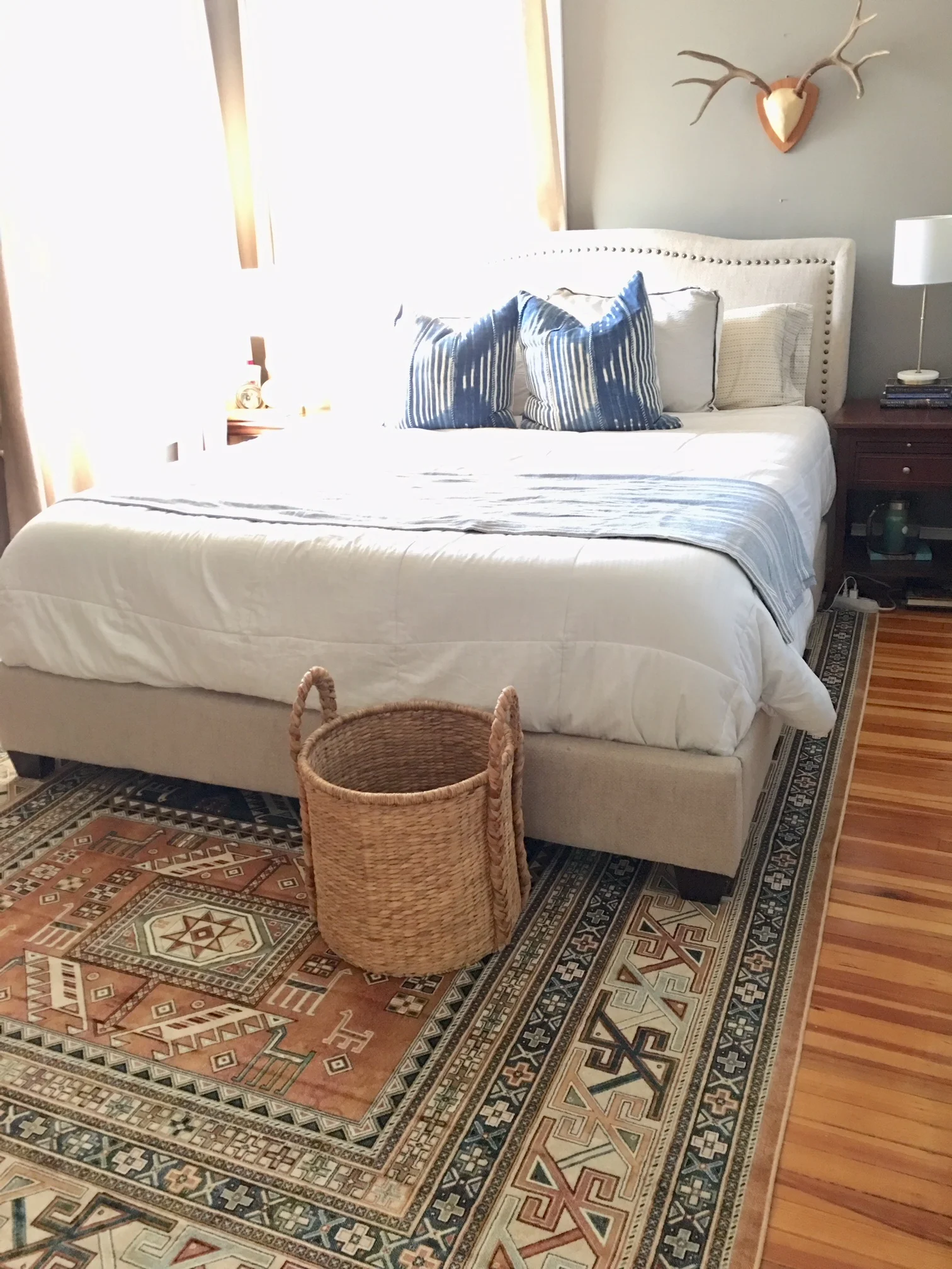 I love the bold antique rug and shibori textiles. Navy is my jam and I have that color throughout my home, so it is only natural I brought it in to the bedroom. Wanting to replicate this look on a budget, I thought the easiest place to find pillows would be Etsy. And while I found a ton of options, I kept thinking how easy it would be to make my own. You can see the pricing below, most were $75 for a 22" pillow. And I wanted big ole Euro sized pillows, so it would have been closer to $125 per pillow.