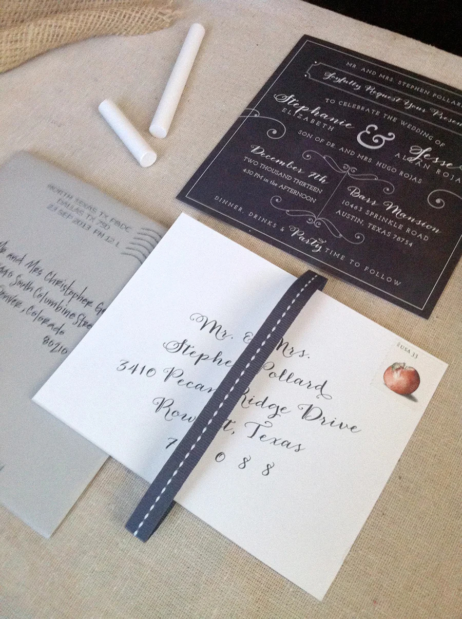 Stephanie is a school teacher, and wanted fun and playful square invitations for her Austin wedding. She loved the look of chalkboard lettering, so I used calligraphy fonts and casual Archer font to tie the whole thing together in her palatte of soft greys. Their December nuptials turned out to be quite a chilly day in South Texas, good thing they had hot chocolate wedding favors, complete with custom stickers!